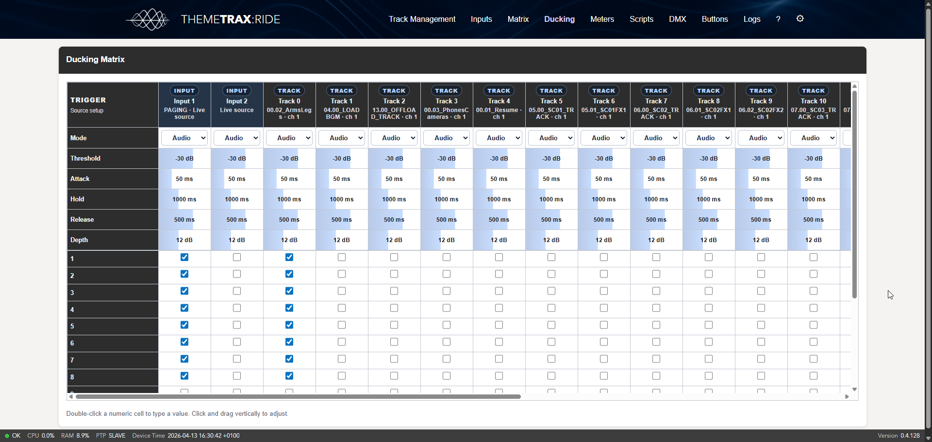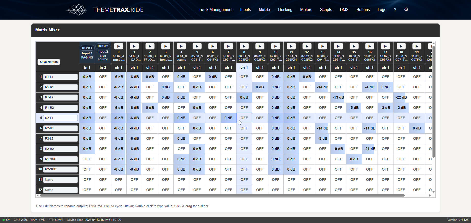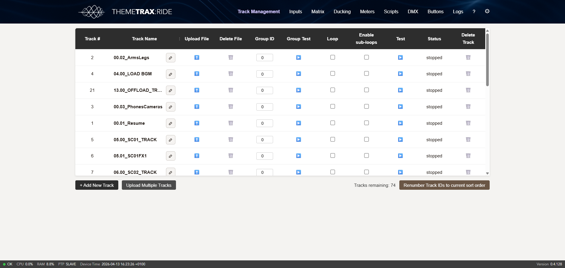 Load upto 96 channels of audio, configure looping, group membership, and test fire tracks.